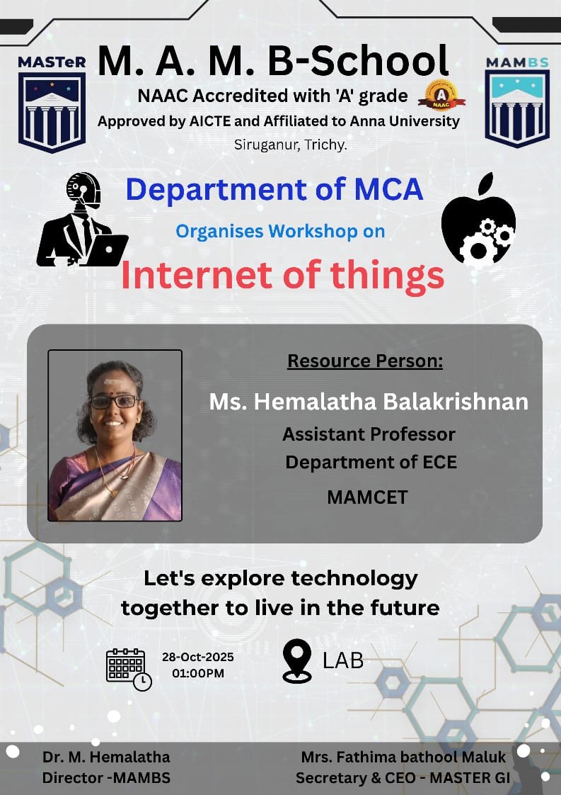 The Department of Master of Computer Applications (MCA), affiliated with Anna University, Chennai, is committed to delivering excellence in computer education and research. The program is designed to produce competent IT professionals equipped with strong theoretical knowledge and practical skills in areas such as software development, database management, networking, and emerging technologies.